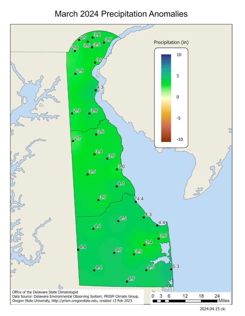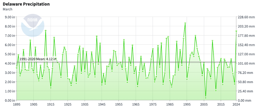 Delaware’s statewide precipitation for March 2024 averaged 7.49 inches, 3.37 inches above the 1991-2020 mean of 4.12 inches (Figure 2). March’s precipitation was the 3rd highest in the last 130 years.