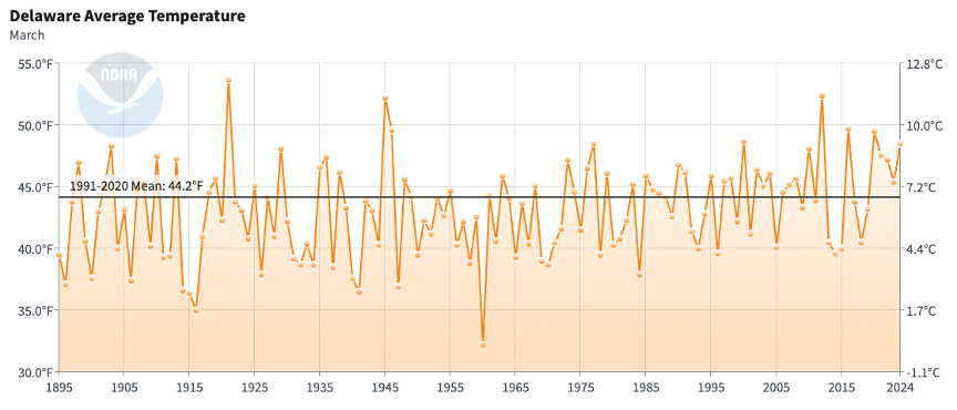 - Figure 1. Delaware statewide mean March temperature (degrees F) 1895-2024. Black line indicates 1991-2020 normal (NOAA, NCEI, Climate at a Glance: Statewide Time Series).