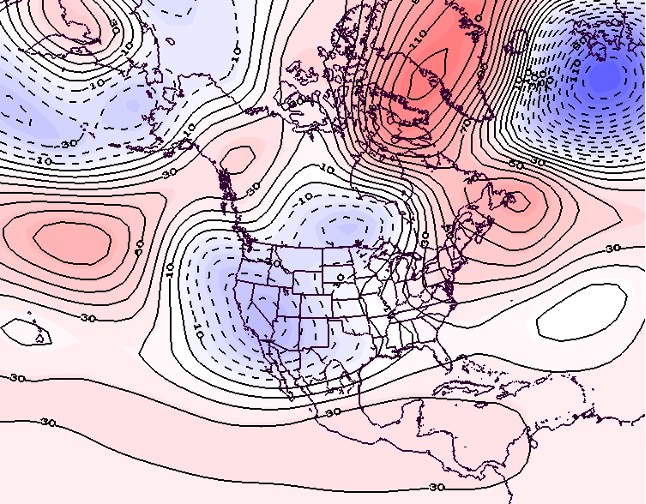 - Figure 7. 500 hPa geopotential height anomalies for March 2024. Negative (blue) anomalies indicate the presence of an anomalous jet stream trough while positive (red) height anomalies indicate the presence of an anomalous jet stream ridge.