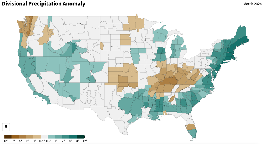 - Figure 6. United States climate division precipitation anomalies (inches) for March 2024 (NOAA, NCEI, Climate at a Glance: Divisional Mapping).