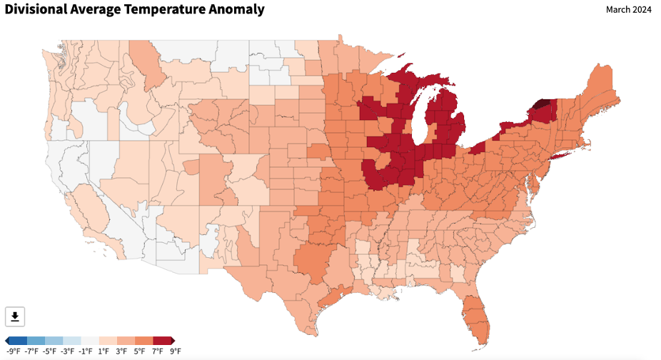 - Figure 5. United States climate division temperature anomalies (degrees F) for March 2024 (NOAA, NCEI, Climate at a Glance: Divisional Mapping).