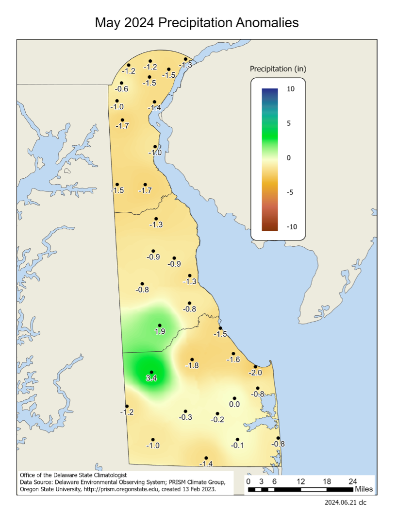 Delaware’s statewide precipitation for May 2024 averaged 2.46 inches, 1.12 inches below the 1991-2020 mean of 3.58 inches (Figure 2). May’s precipitation was in the bottom one-third of values over the last 130 years.