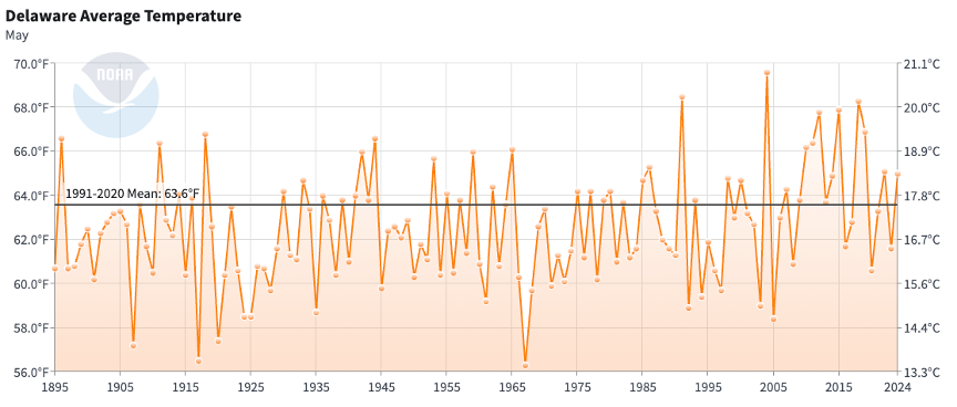 - Figure 1. Delaware statewide mean May temperature (degrees F) 1895-2024. Black line indicates 1991-2020 normal (NOAA, NCEI, Climate at a Glance: Statewide Time Series).