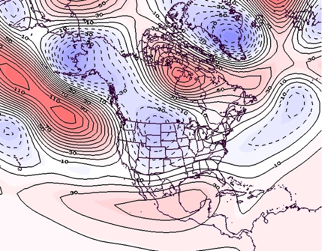 - Figure 7. 500 hPa geopotential height anomalies for May 2024. Negative (blue) anomalies indicate the presence of an anomalous jet stream trough while positive (red) height anomalies indicate the presence of an anomalous jet stream ridge.