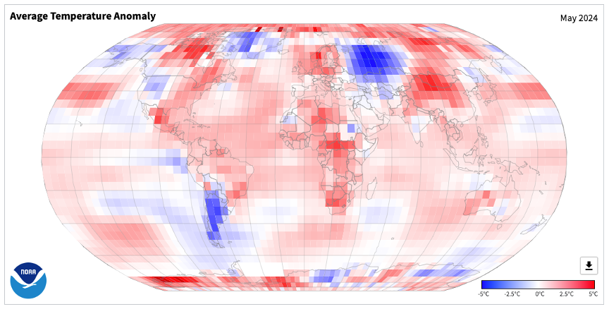 - Figure 8. Global temperature anomalies (degrees C) for May 2024 (NOAA, NCEI, Climate at a Glance: Global Mapping).
