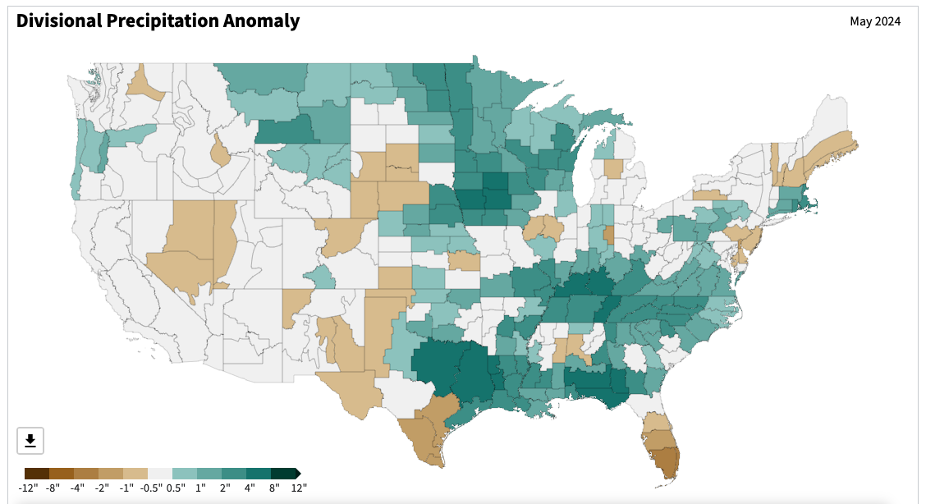 - Figure 6. United States climate division precipitation anomalies (inches) for May 2024 (NOAA, NCEI, Climate at a Glance: Divisional Mapping).