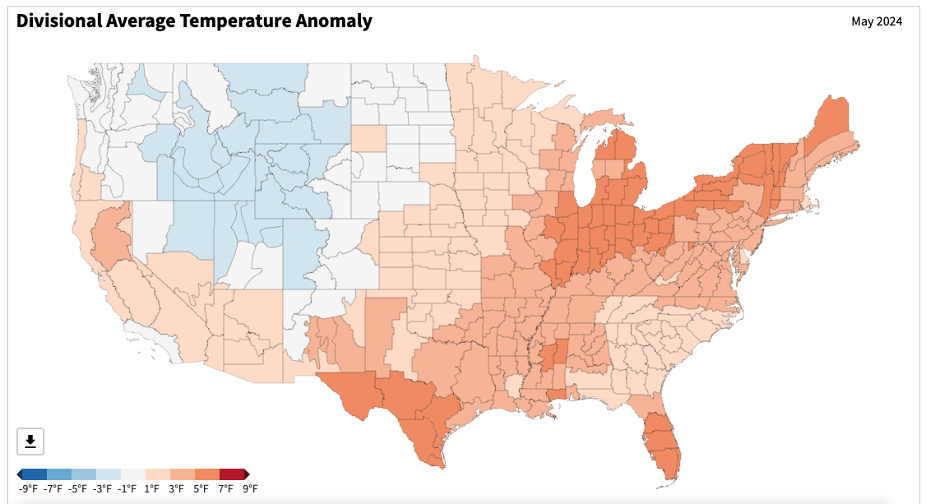 - Figure 5. United States climate division temperature anomalies (degrees F) for May 2024 (NOAA, NCEI, Climate at a Glance: Divisional Mapping).