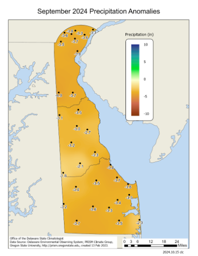 Delaware’s statewide precipitation for September 2024 averaged 0.73 inches, 3.49 inches below the 1991-2020 mean of 4.22 inches (Figure 2). September 2024 was the 3rd driest September since observations began in 1895.