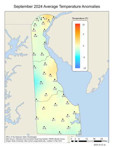 - Figure 3. September 2024 average temperature departures (degrees F) from the 1991-2020 mean based upon DEOS station data.