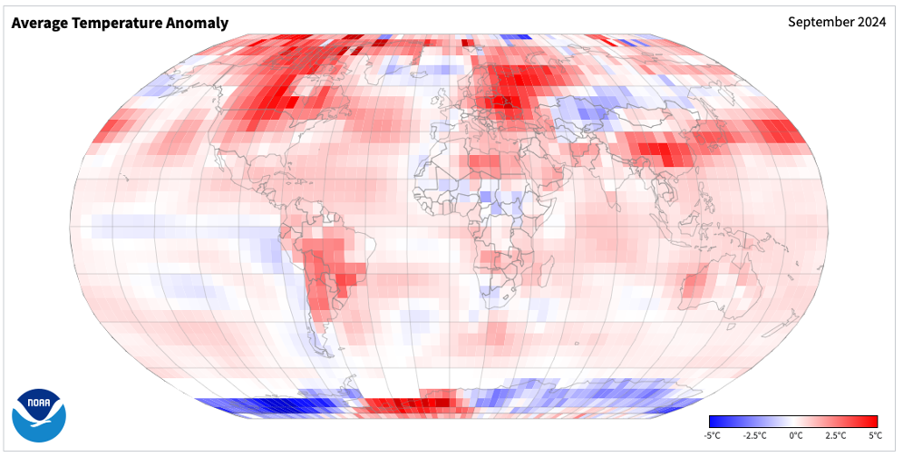 September 2024 ranked as the second warmest September on record for the globe since 1850. Global temperatures were 1.24°C (2.23°F) above the 1901-2000 mean. Particular warmth was found across western northern North America, Eastern Europe, and China (Figure 8).