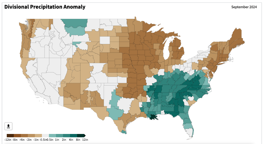 - Figure 6. United States climate division precipitation anomalies (inches) for September 2024 (NOAA, NCEI, Climate at a Glance: Divisional Mapping).