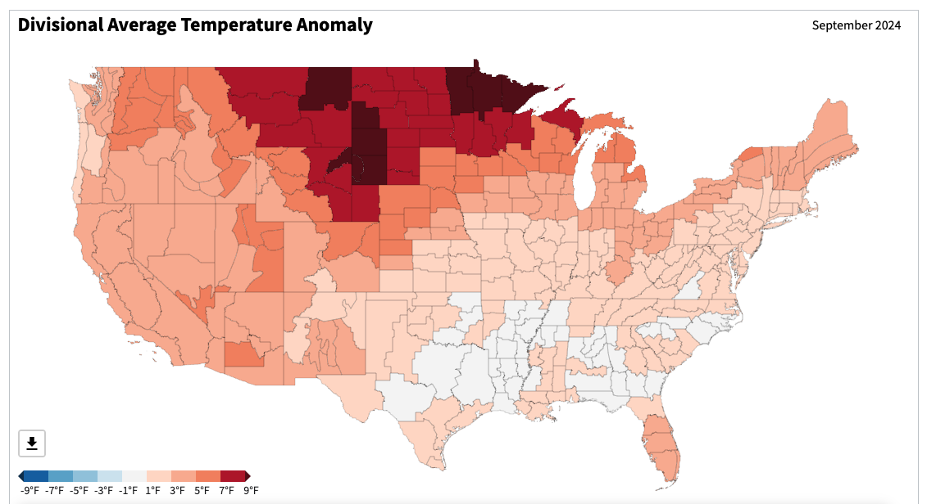 - Figure 5. United States climate division temperature anomalies (degrees F) for September 2024 (NOAA, NCEI, Climate at a Glance: Divisional Mapping).