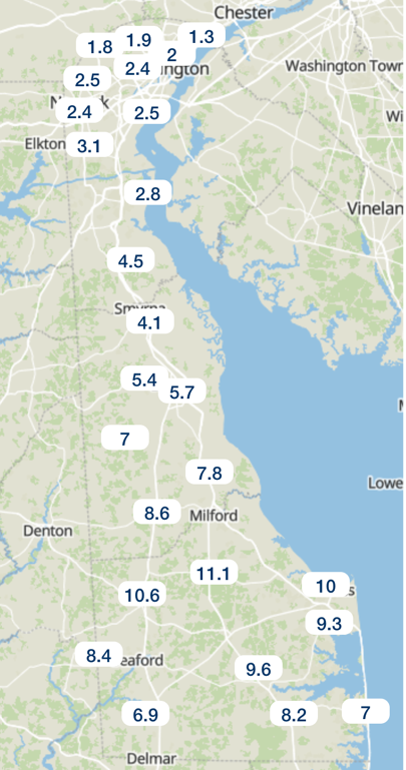 Snowfall totals of over 10 inches were common across much of northern Sussex County with values decreasing from south to north across Kent and New Castle Counties (Figure 4).