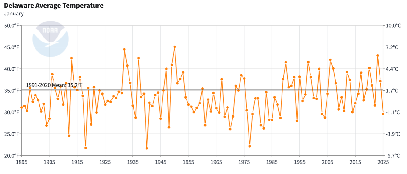- Figure 1. Delaware statewide mean January temperature (degrees F) 1895-2025. The black line indicates the 1991-2020 normal (NOAA, NCEI, Climate at a Glance: Statewide Time Series).