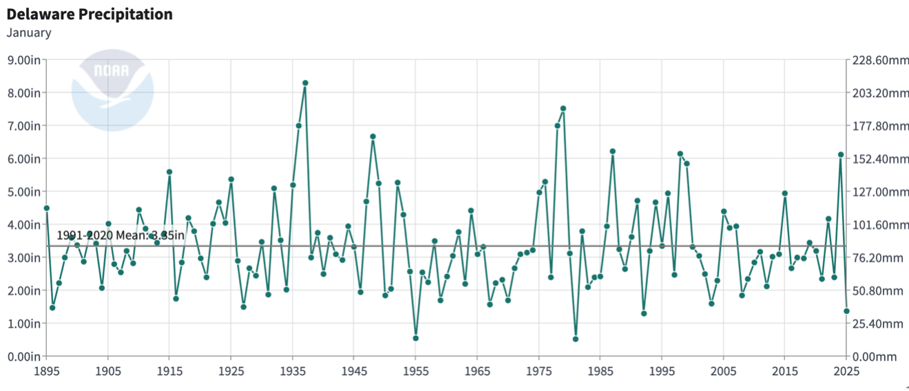 - Figure 2. Delaware statewide January precipitation (inches) 1895-2025. The Black line indicates the 1991-2020 normal (NOAA, NCEI, Climate at a Glance: Statewide Time Series).