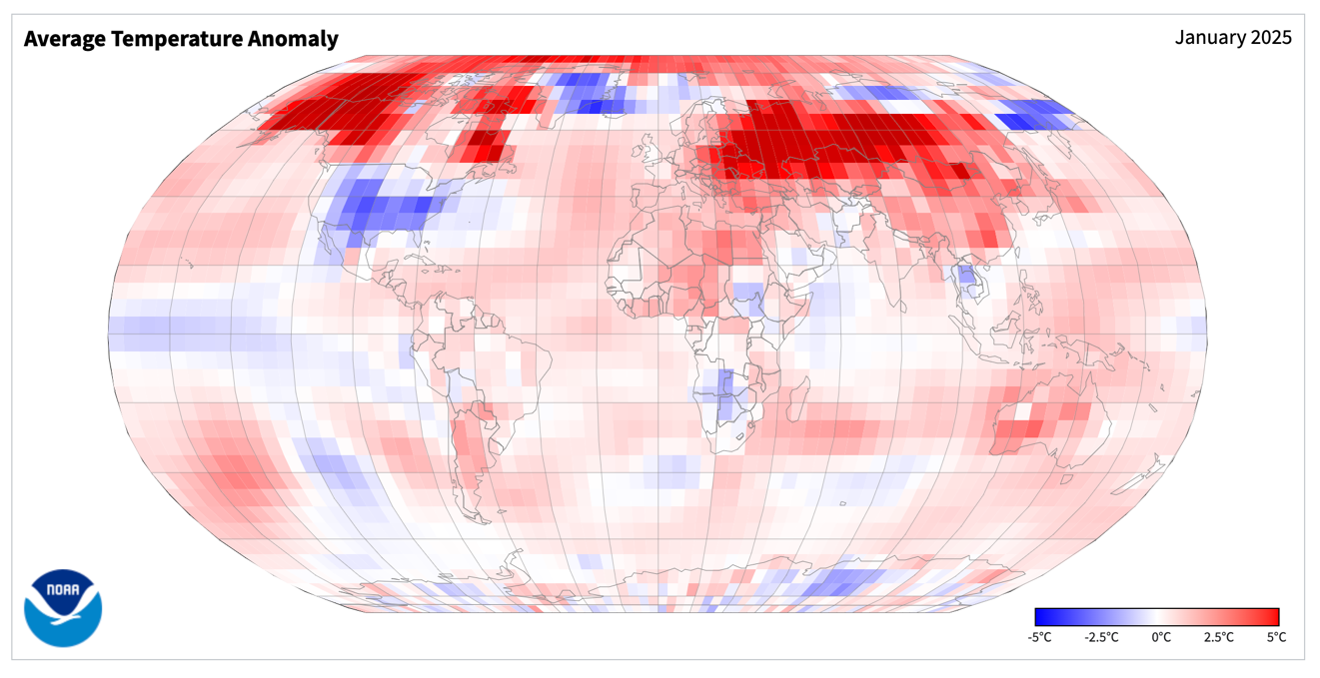 - Figure 8. Global temperature anomalies (degrees C) for January 2025 (NOAA, NCEI, Climate at a Glance: Global Mapping).