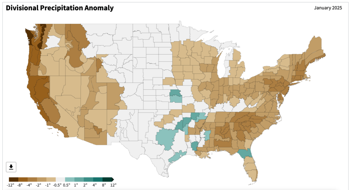 - Figure 6. United States climate division precipitation anomalies (inches) for January 2025 (NOAA, NCEI, Climate at a Glance: Divisional Mapping).