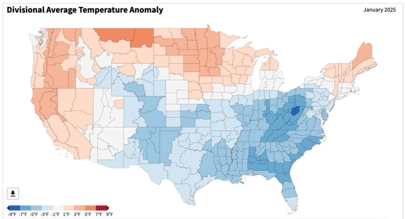 - Figure 5. United States climate division temperature anomalies (oF) for January 2025 (NOAA, NCEI, Climate at a Glance: Divisional Mapping).