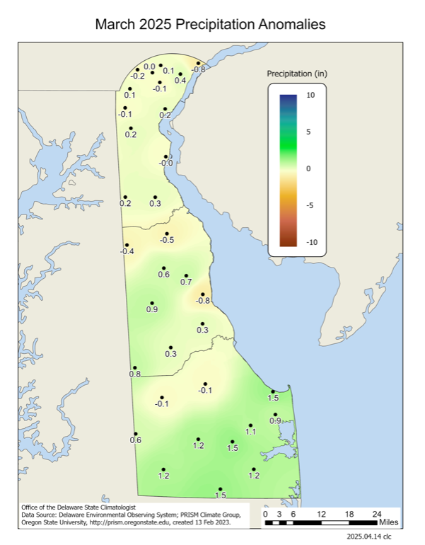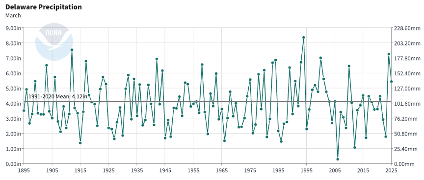 Delaware’s statewide precipitation for March 2025 averaged 5.44 inches, 1.32 inches above the 1991-2020 mean of 4.12 inches (Figure 2). March 2025 precipitation was in the top one-third of all March precipitation totals since 1895.