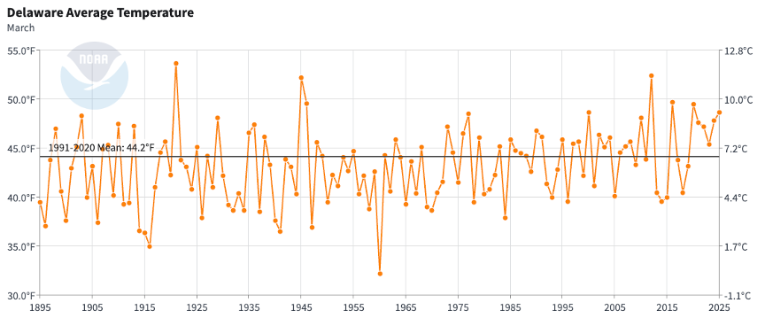 - Figure 1. Delaware statewide mean March temperature (degrees F) 1895-2025. The black line indicates the 1991-2020 normal (NOAA, NCEI, Climate at a Glance: Statewide Time Series).
