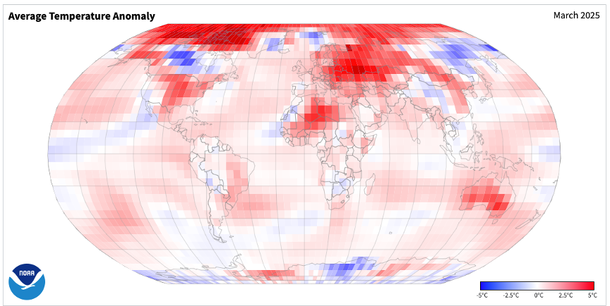 March 2025 ranked as the third warmest March on record for the globe since 1850. Global temperatures were 2.36o F above the 1901-2000 mean. Particular warmth was found across the Arctic, the central portions of the United States, and much of eastern Europe (Figure 8).