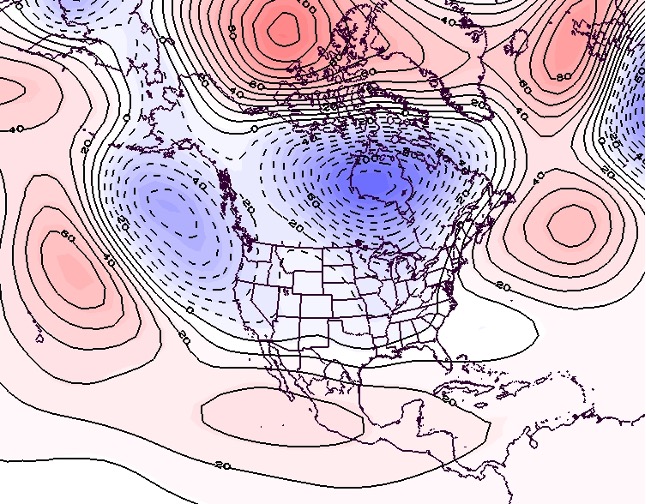 - Figure 7. 500 hPa geopotential height anomalies for March 2025. Negative (blue) anomalies indicate the presence of an anomalous jet stream trough while positive (red) height anomalies indicate the presence of an anomalous jet stream ridge.