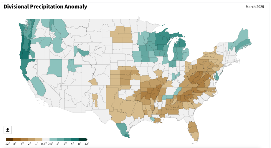 - Figure 6. United States climate division precipitation anomalies (inches) for March 2025 (NOAA, NCEI, Climate at a Glance: Divisional Mapping).