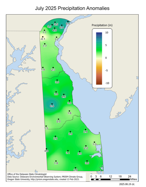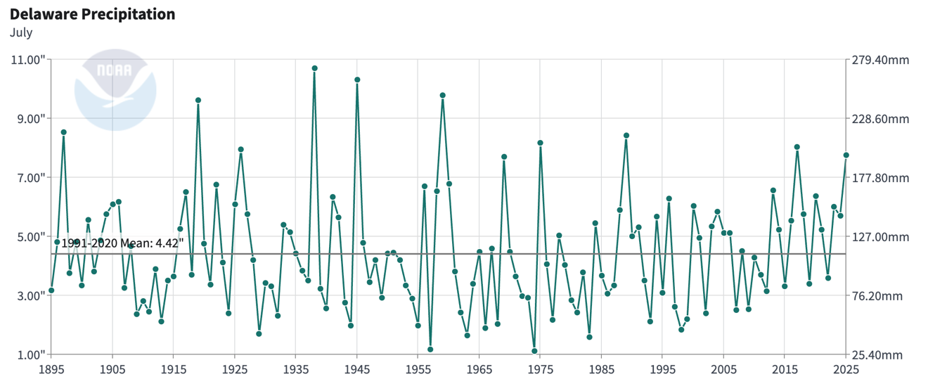 Delaware’s statewide precipitation for July 2025 averaged 7.75 inches, 3.33 inches above the 1991-2020 mean of 4.42 inches (Figure 2). July 2025 was the 10th wettest July since records began in 1895.
