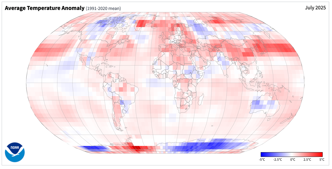 July 2025 ranked as the third warmest July on record for the globe since 1850. Global temperatures were 1.80°F (1.00°C) above the 1901-2000 mean. Particular warmth was found across eastern Asia and parts of Europe, while cooler than normal conditions were scattered across much of Antarctica (Figure 8).