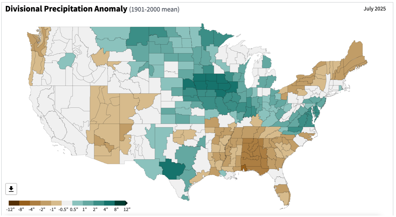 - Figure 6. United States climate division precipitation anomalies (inches) for July 2025 (NOAA, NCEI, Climate at a Glance: Divisional Mapping).