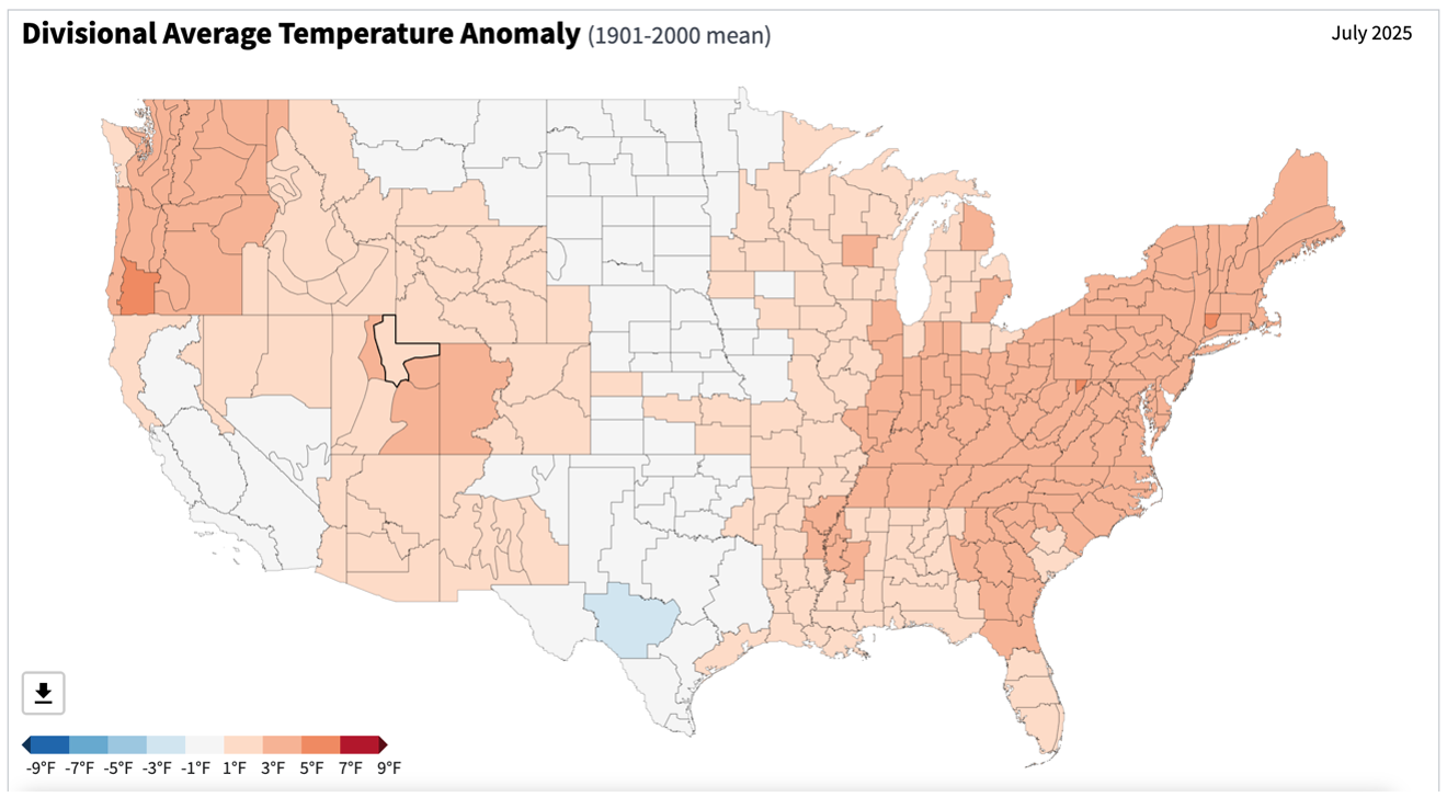 Preliminary data indicates that the statewide average temperature in July was 80.1°F, which is 2.7°F above the 1991-2020 mean value of 77.4°F (Figure 1). July 2025 was the 4th warmest July on record since 1895.