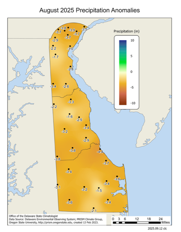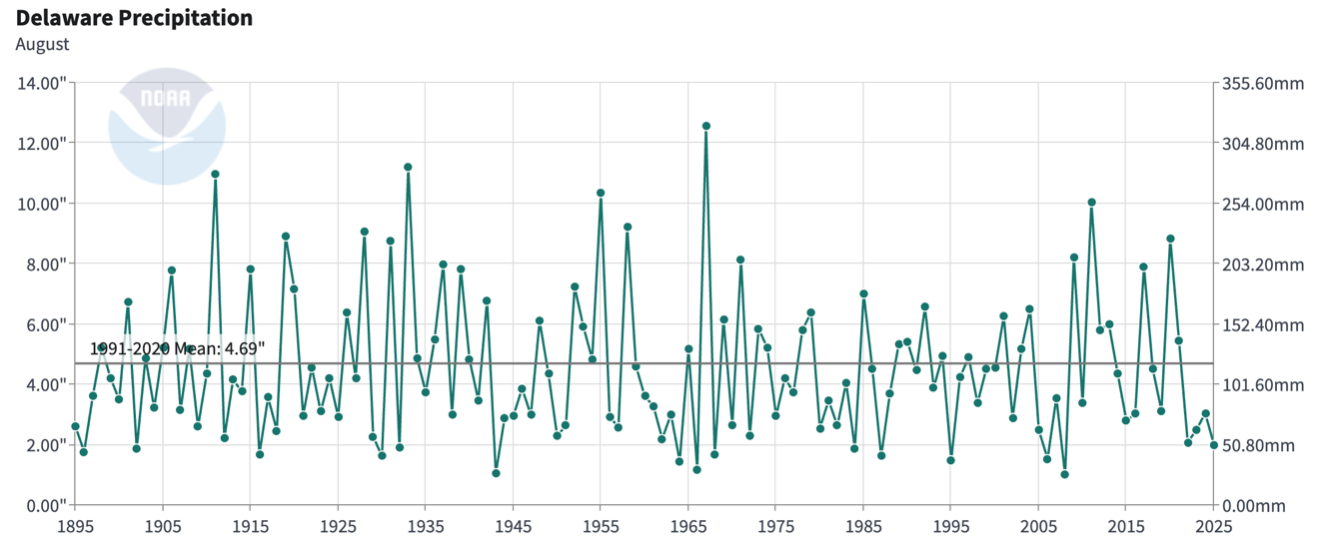 Delaware’s statewide precipitation for August 2025 averaged 2.01 inches, 2.68 inches below the 1991-2020 mean of 4.69 inches (Figure 2). August 2025 was the 15th driest August since records began in 1895.