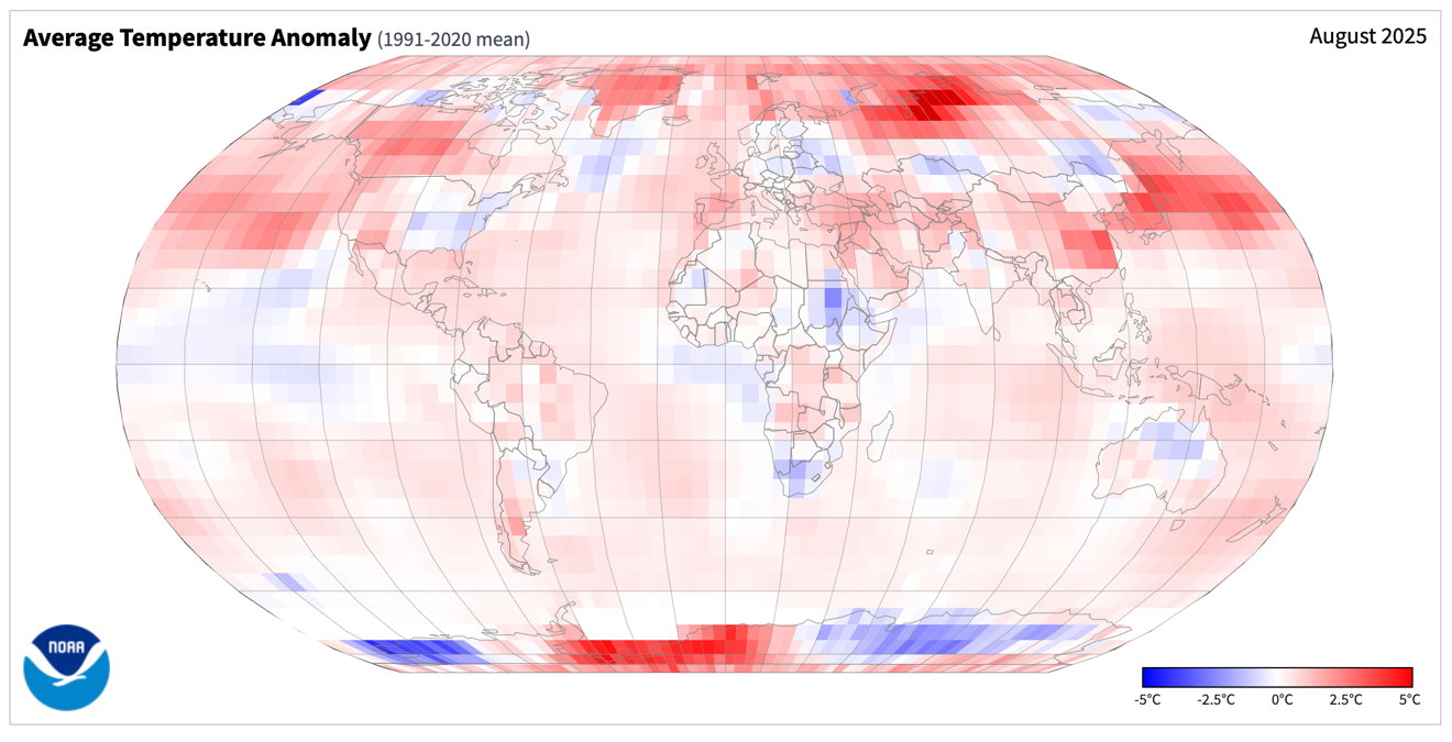 - Figure 8. Global temperature anomalies (degrees C) for August 2025 (NOAA, NCEI, Climate at a Glance: Global Mapping).