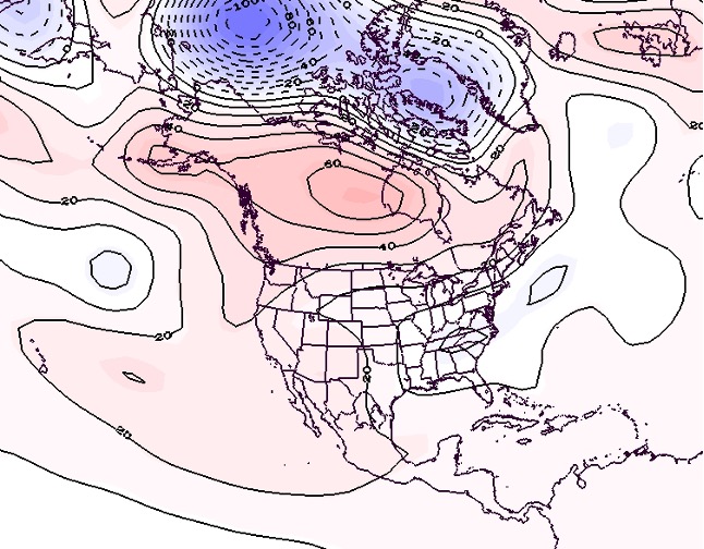 - Figure 7. 500 hPa geopotential height anomalies for August 2025. Negative (blue) anomalies indicate the presence of an anomalous jet stream trough while positive (red) height anomalies indicate the presence of an anomalous jet stream ridge.