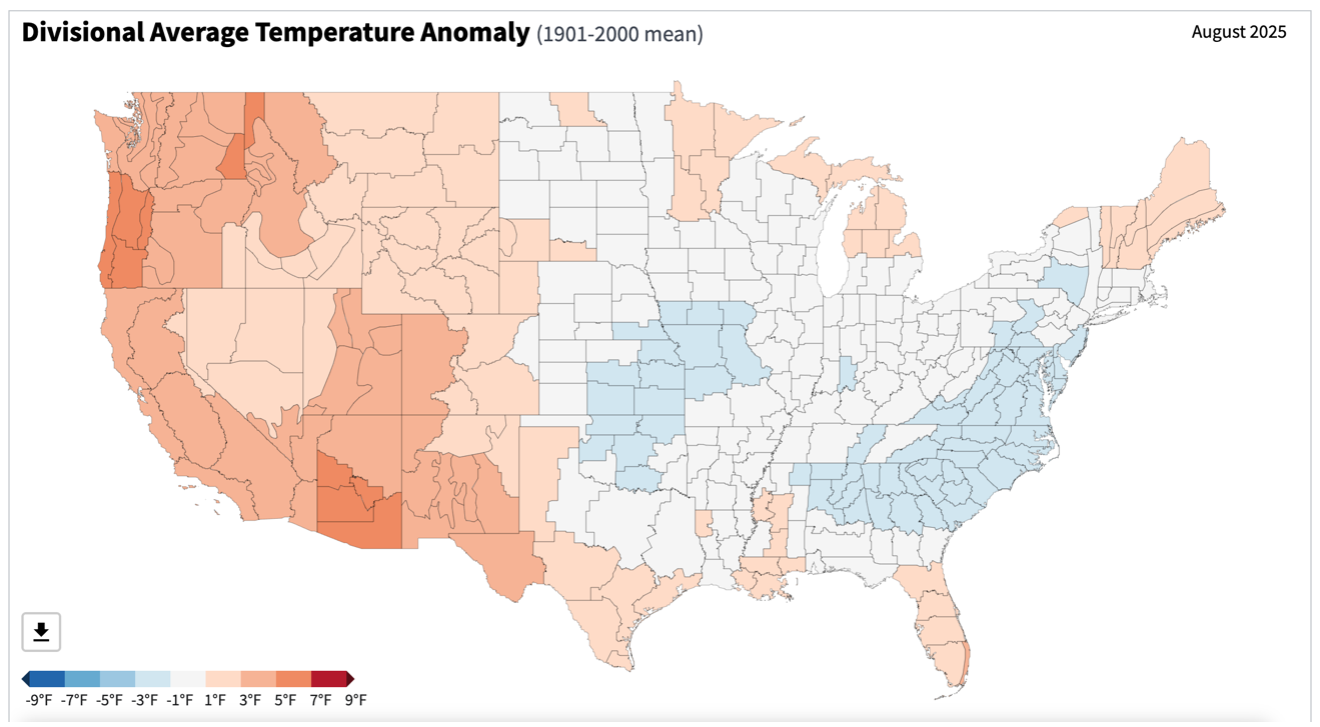 - Figure 5. United States climate division temperature anomalies (degrees F) for August 2025 (NOAA, NCEI, Climate at a Glance: Divisional Mapping).