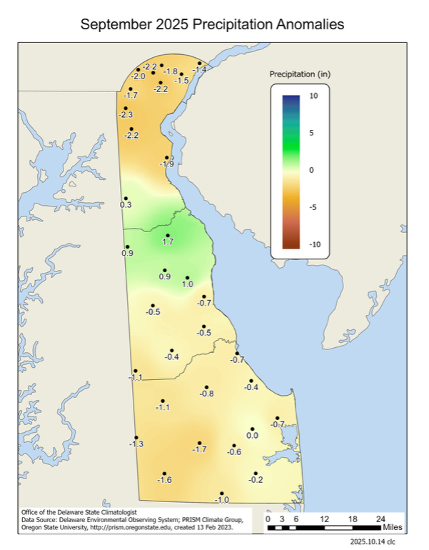 Delaware’s statewide precipitation for September 2025 averaged 2.73 inches, 1.49 inches below the 1991-2020 mean of 4.22 inches (Figure 2). September 2025 was the 50 th driest September since records began in 1895.