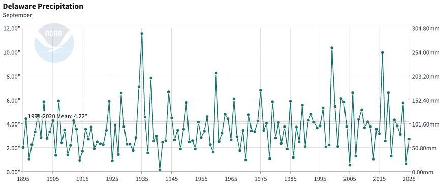 - Figure 2. Delaware statewide September precipitation (inches) 1895-2025. The Black line indicates the 1991-2020 normal (NOAA, NCEI, Climate at a Glance: Statewide Time Series).
