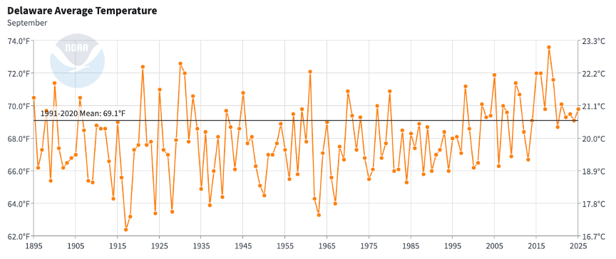 - Figure 1. Delaware statewide mean September temperature ( degrees F) 1895-2025. The black line indicates the 1991-2020 normal (NOAA, NCEI, Climate at a Glance: Statewide Time Series).