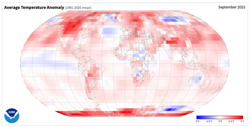 - Figure 8. Global temperature anomalies ( degrees C) for September 2025 (NOAA, NCEI, Climate at a Glance: Global Mapping).