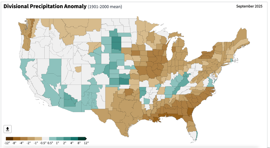 - Figure 6. United States climate division precipitation anomalies (inches) for September 2025 (NOAA, NCEI, Climate at a Glance: Divisional Mapping).