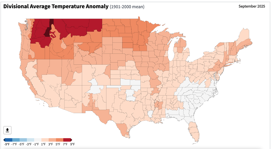 - Figure 5. United States climate division temperature anomalies ( degrees F) for September 2025 (NOAA, NCEI, Climate at a Glance: Divisional Mapping).