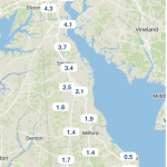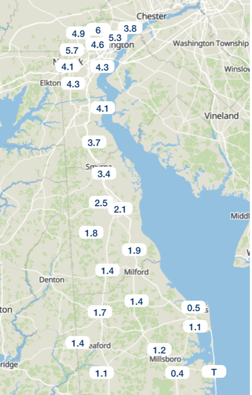 Data from the Delaware Environmental Observing System (DEOS) show that temperature departures were uniformly negative across the State (Figure 3), with the largest negative temperature anomalies found across Kent and New Castle Counties. Precipitation was below normal throughout the state despite a statewide snowfall event on December 14th that resulted in between 4 inches and 6 inches of snow across New Castle County (Figure 4).