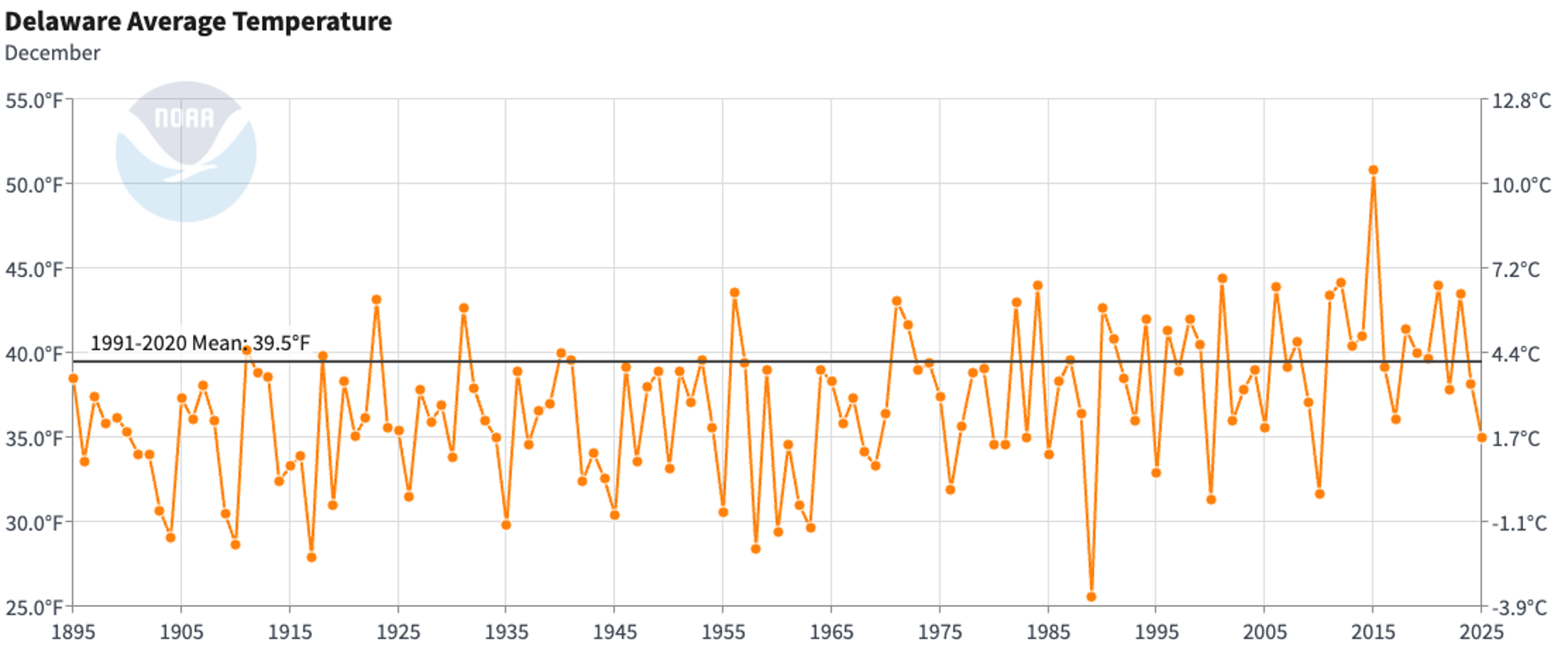 - Figure 1. Delaware statewide mean December temperature (degrees F) 1895-2025. The black line indicates the 1991-2020 normal (NOAA, NCEI, Climate at a Glance: Statewide Time Series).