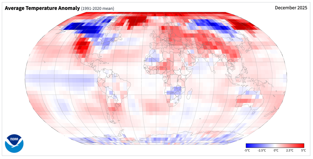 - Figure 8. Global temperature anomalies (degrees C) for December 2025 (NOAA, NCEI, Climate at a Glance: Global Mapping).