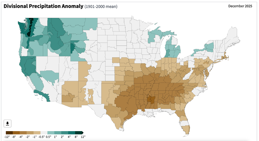 - Figure 6. United States climate division precipitation anomalies (inches) for December 2025 (NOAA, NCEI, Climate at a Glance: Divisional Mapping).