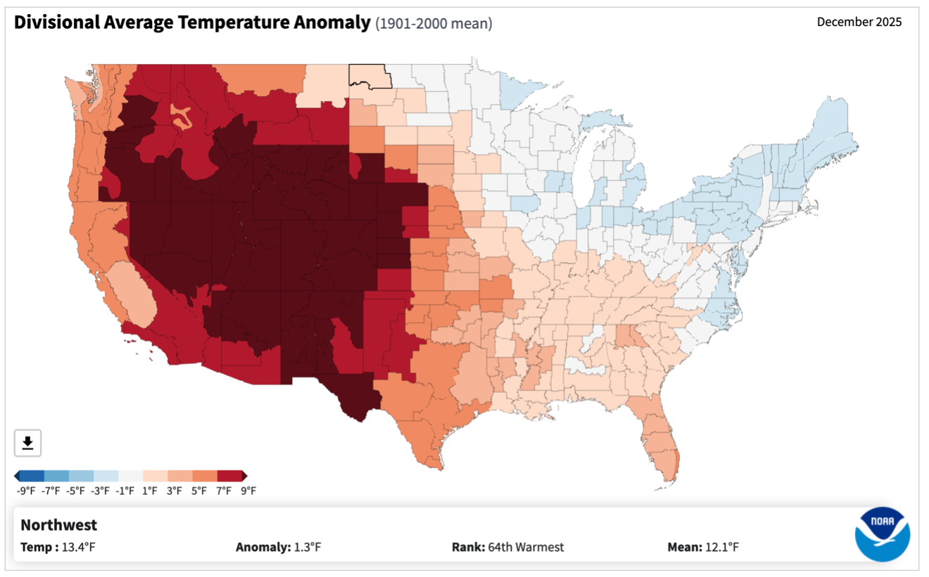 - Figure 5. United States climate division temperature anomalies (degrees F) for December 2025 (NOAA, NCEI, Climate at a Glance: Divisional Mapping).