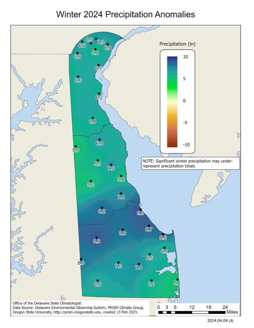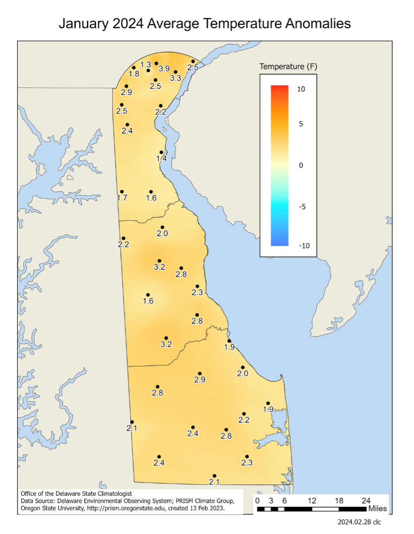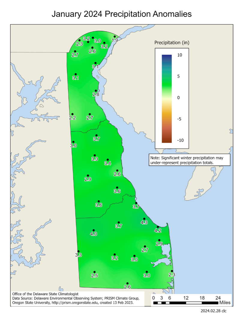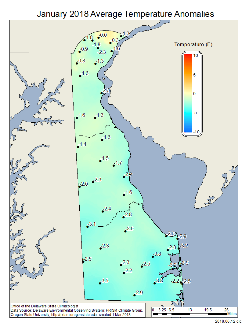 Data from the Delaware Environmental Observing System (DEOS) show that temperatures were uniformly cold across the State, with many locations seeing negative departures of greater than 5°F (Figure 3). Delaware experienced one major snowfall event on January 6th.
