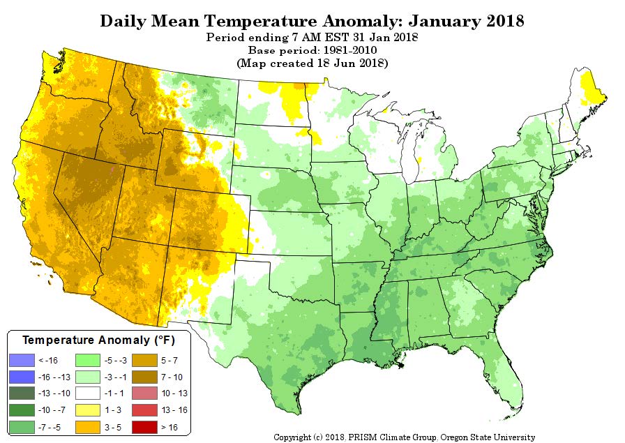 Temperatures were below normal across the southern Rockies, the Mississippi Valley, the Southeast, and the Mid Atlantic (Figure 5), while locations across New England, the upper Midwest and the Pacific Coast saw above normal temperatures. Precipitation was generally below normal along both the Atlantic and Pacific Coasts (Figure 6), while the central portion of the country had near or just above normal precipitation. The 500 hPa height pattern for January showed an anomalous jet stream trough covering the eastern two-thirds of the United States (Figure 7) contributing to the temperature anomalies across the country.