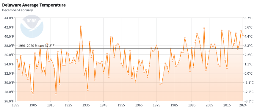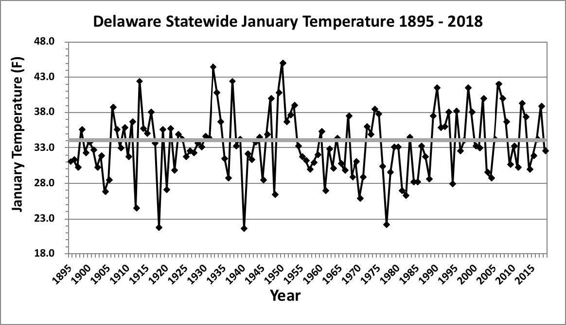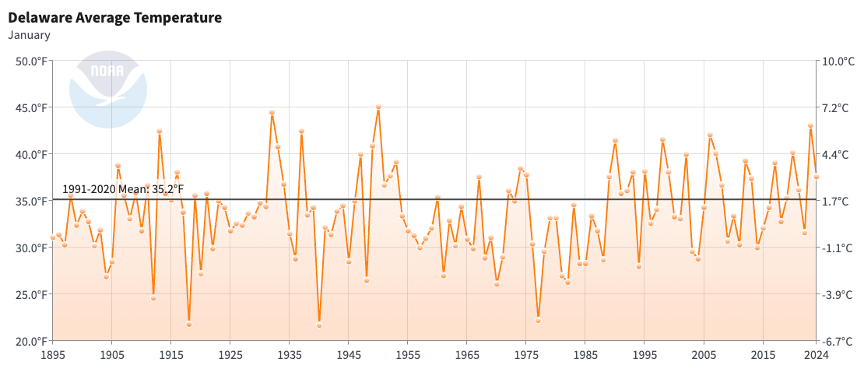 - Figure 1. Delaware statewide mean January temperature (degrees F) 1895-2025. The black line indicates the 1991-2020 normal (NOAA, NCEI, Climate at a Glance: Statewide Time Series).