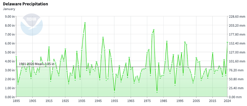 - Figure 2. Delaware statewide January precipitation (inches) 1895-2025. The Black line indicates the 1991-2020 normal (NOAA, NCEI, Climate at a Glance: Statewide Time Series).